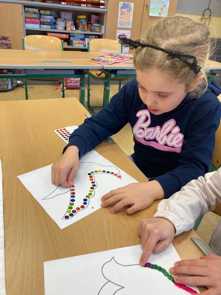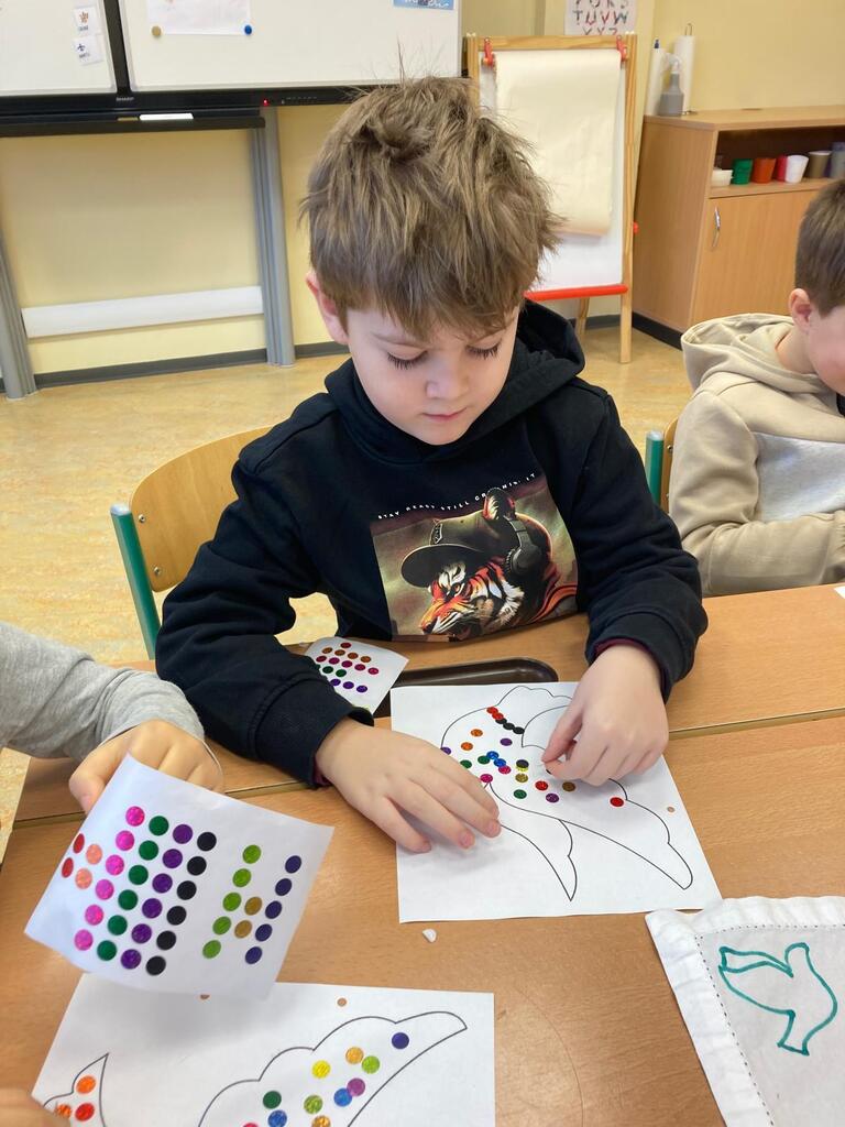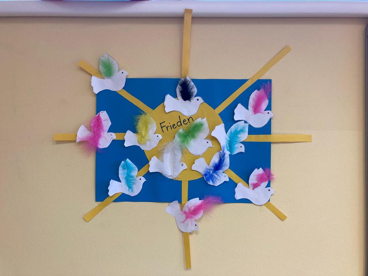 Im kreativen Teil des Projekts gestalten die Kinder Friedenstauben, die nun die Fenster der Klasse schmücken. Sie stehen symbolisch für den Wunsch nach Frieden und machen das Projekt für alle sichtbar.