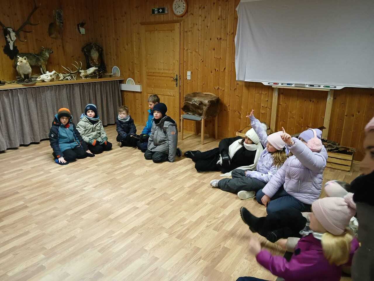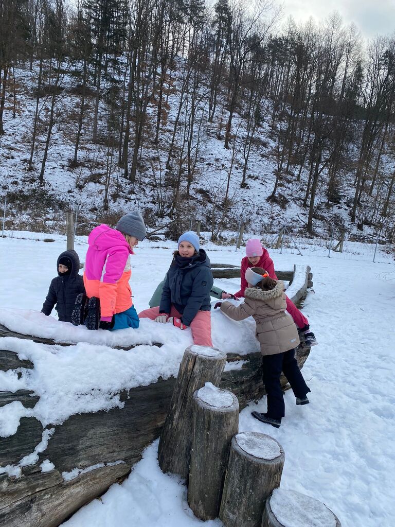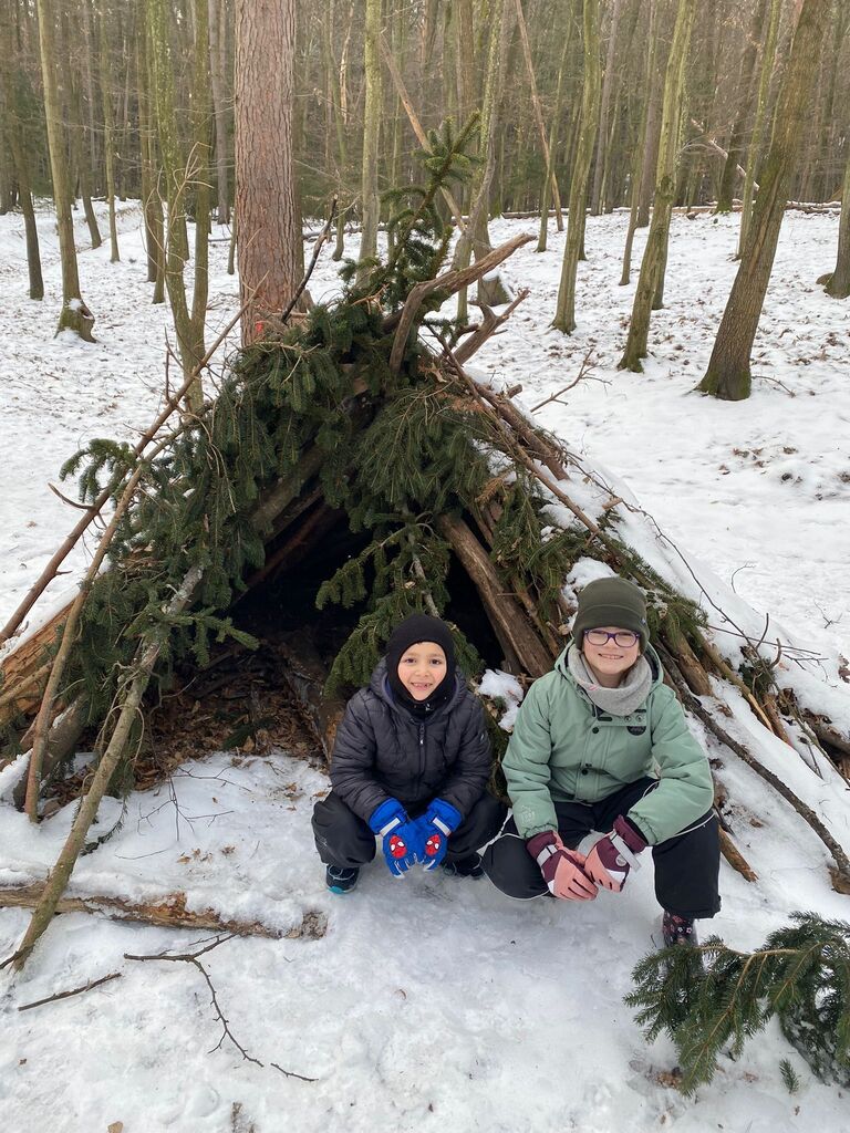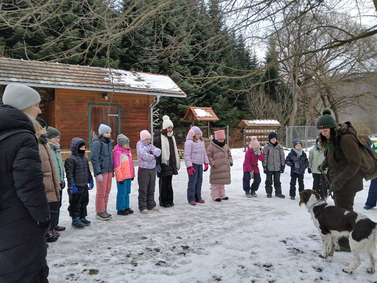 Die Kinder der 3b und 3c durften am Montag in der Werkstatt Natur den Wald im Winter entdecken. Sie erfuhren viel über Tierspuren im Winter, die Überlebensstrategien der Tiere und den Jagdhund.